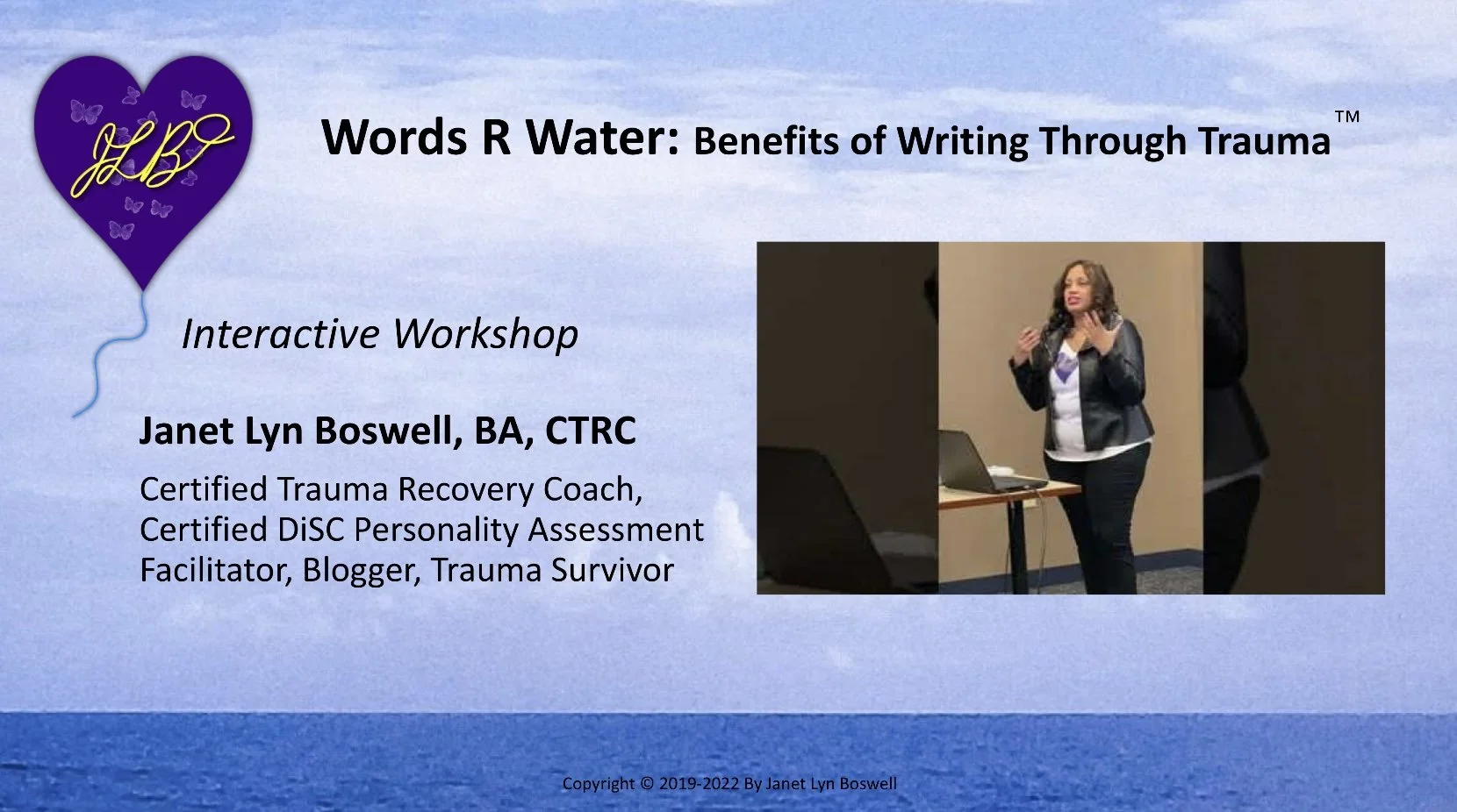 *Words R Water: Benefits of Writing Through Trauma® Attendees learn how writing helps with stress-management on a biological, mental, social, and emotional level, and they participate in several writing practices to help identify their favorite tool.